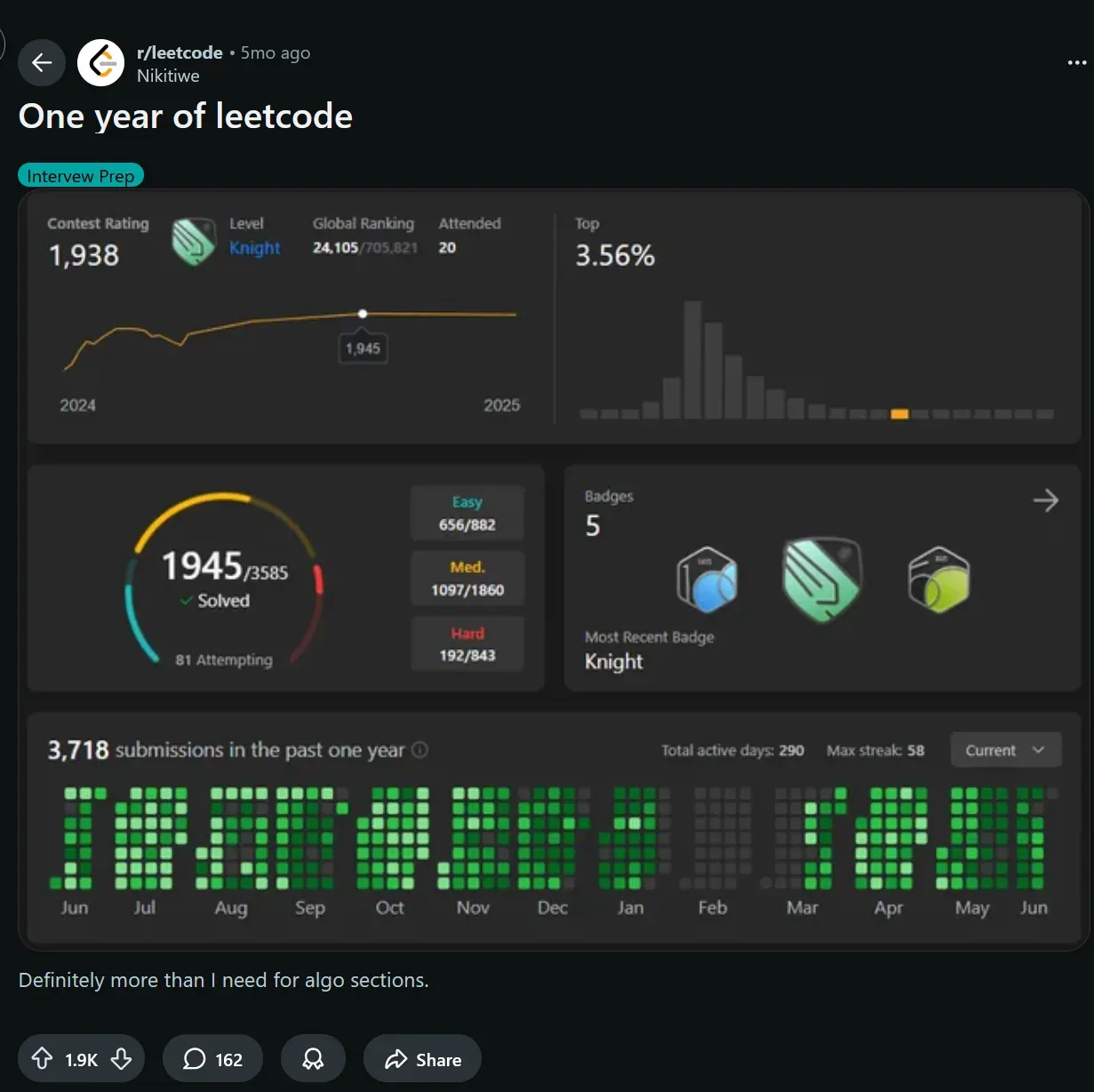 I will first show my current progress, albeit by my own standards I improved quite slowly, but objectively it has worked with great success for general technical interviews and OAs (i.e. FAANG, quant firms, etc…). I have never needed to study specifically for such interviews.