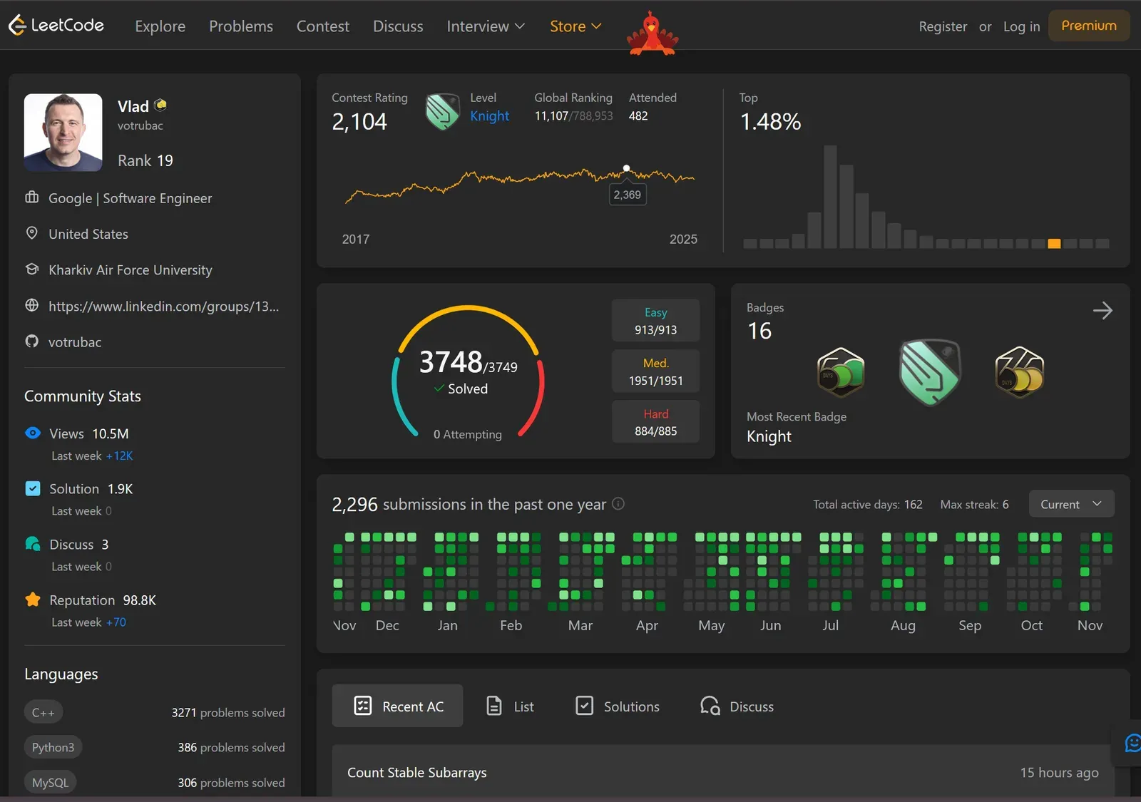 | Resource | LeetCode Rating | Codeforces Rating | Achievements |